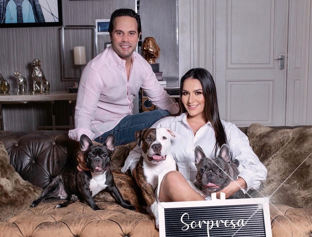 La foto compartida se muestra a ella junto a su esposo y sus tres perros. También se ve un letrero que dice “sorpresa, bebé en camino”.